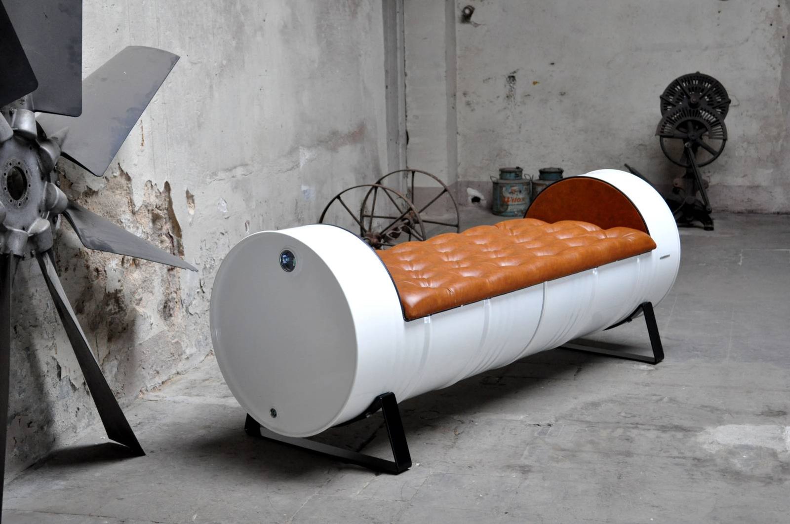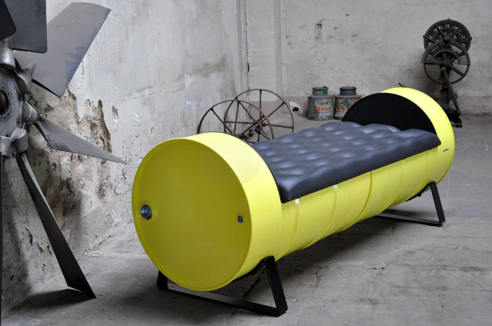 Banc industriel en tonneaux métal 200L upcyclés – 3 places avec coussin capitonné