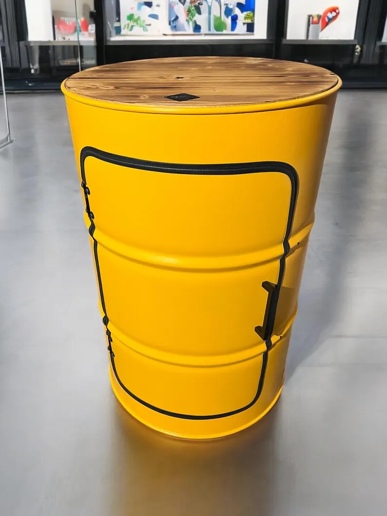 DENNIS est bien plus qu’un simple meuble : c’est une pièce de mobilier upcyclée issue d’un véritable fût industriel de 208 litres, soigneusement restauré et transformé à la main. Chaque fût est sélectionné pour sa solidité, puis nettoyé, renforcé et repeint afin de lui offrir une seconde vie élégante et fonctionnelle.