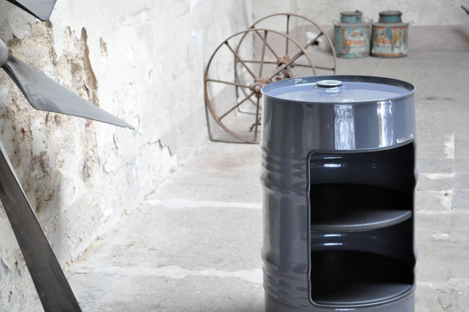 Étagère Upcycling en Tonneau Métal 60L – Découpe Frontale Design Industriel