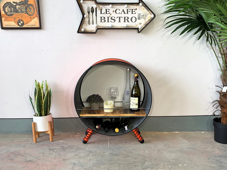 L’étagère upcyclée ZOE transforme un ancien tonneau métallique de 200 L en un meuble design au style industriel affirmé. À la fois étagère décorative et mini bar, elle offre un rangement pratique pour bouteilles, verres et objets déco.