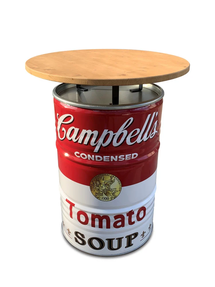 Apportez une touche pop art et industrielle à vos espaces avec ce mange-debout upcyclé en baril métal 200L. Inspiré de l’iconique soupe Campbell’s, il associe un tonneau en acier recyclé à un plateau en bois laqué robuste.