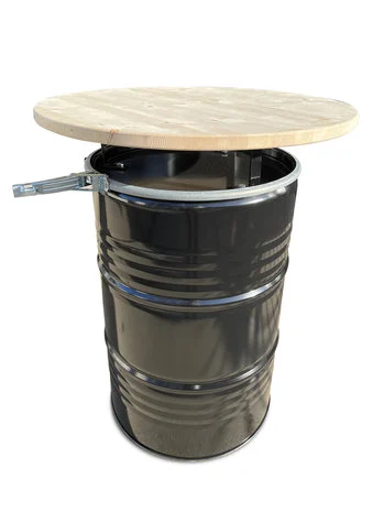Mange-debout industriel en baril métal 200L avec plateau bois – Table haute upcycling