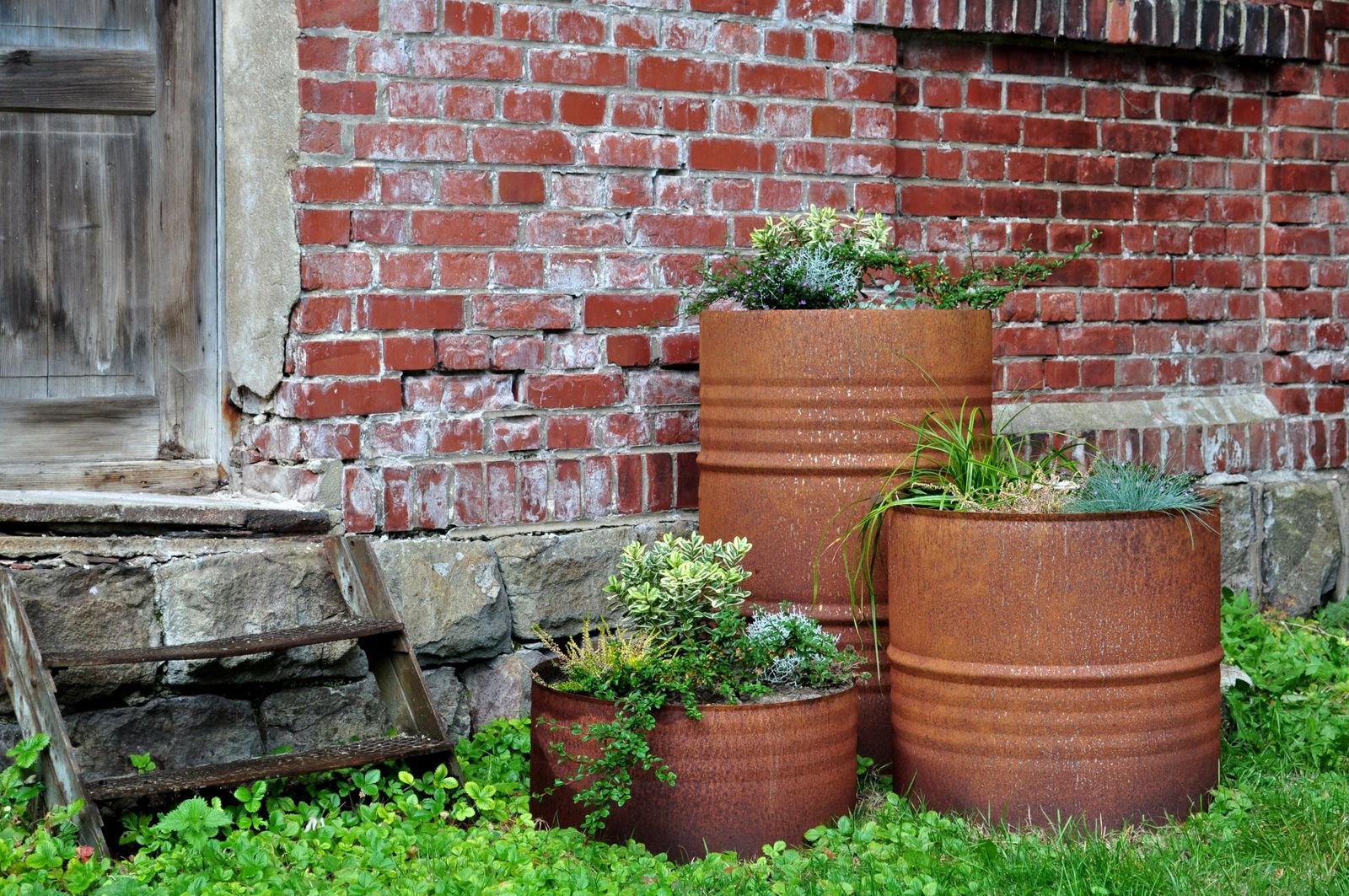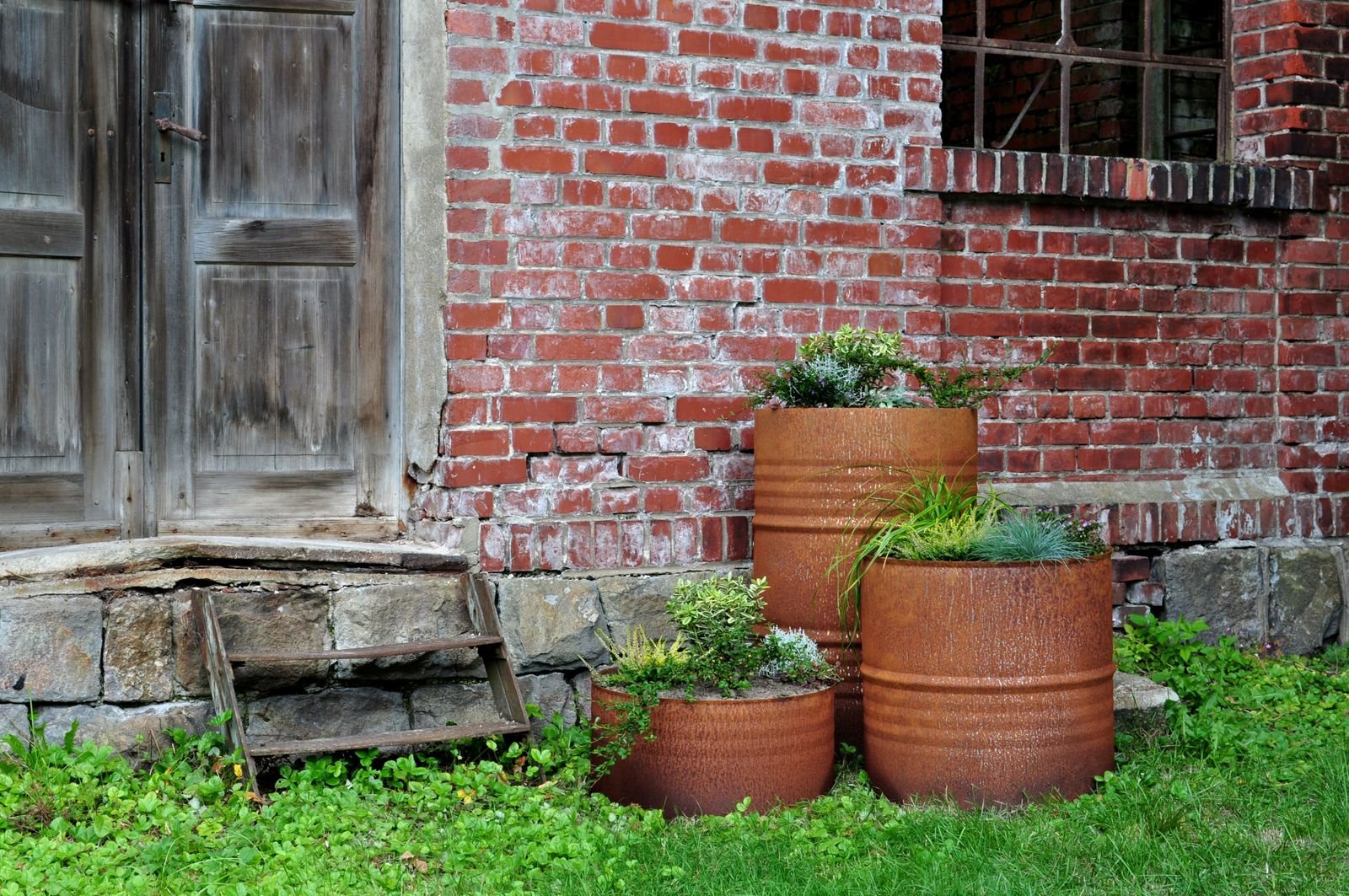 Pflanzkübel upcyclé en tonneau métal 200 L – Jardinière industrielle design
