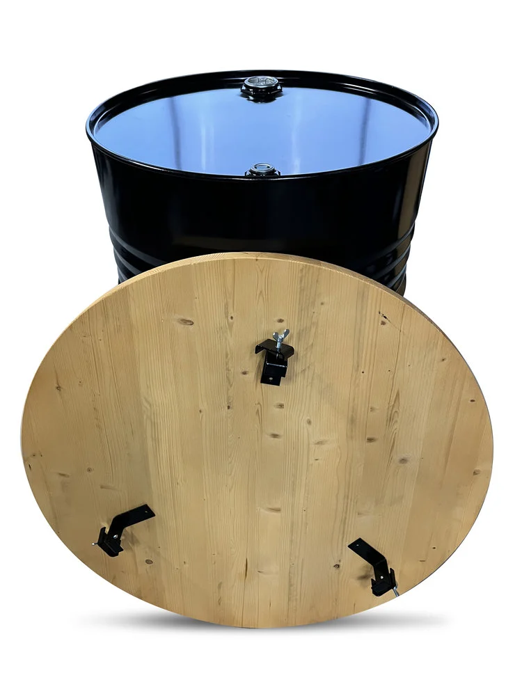 Transformez facilement votre fût métallique 200L/210L en mange-debout design grâce à ce plateau en bois verni robuste et résistant aux intempéries.