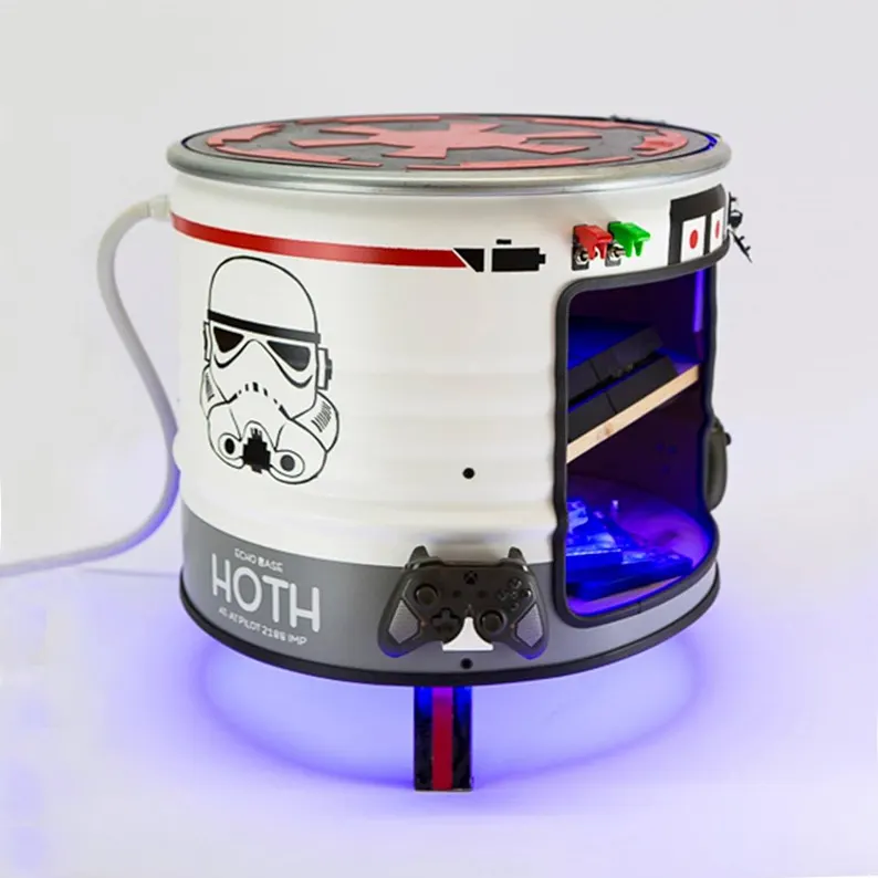 Cette table d’appoint gamer est bien plus qu’un simple meuble : c’est une pièce de mobilier upcyclé issue de la transformation artisanale d’un baril métal industriel. Chaque création est réalisée sur commande, sans reproduction de design, afin de garantir une pièce véritablement unique. Vous participez activement à la conception : thème visuel, finitions, accessoires techniques et style général sont définis ensemble.