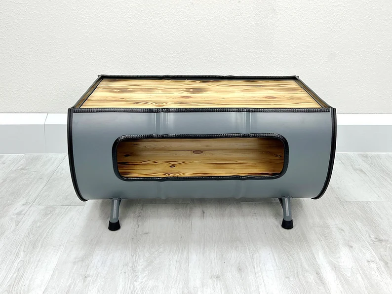 - Structure : baril métal industriel recyclé (format horizontal)