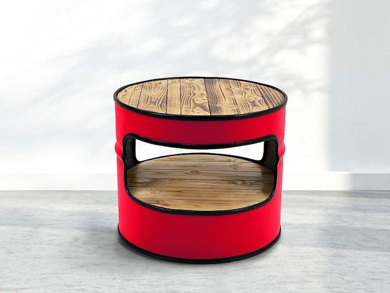 La table basse « Otto » transforme un fût pétrolier de 200 L recyclé en un meuble design, robuste et éco-responsable. Son plateau en bois de palette flammé et sa structure métallique mate apportent un style industriel vintage unique.