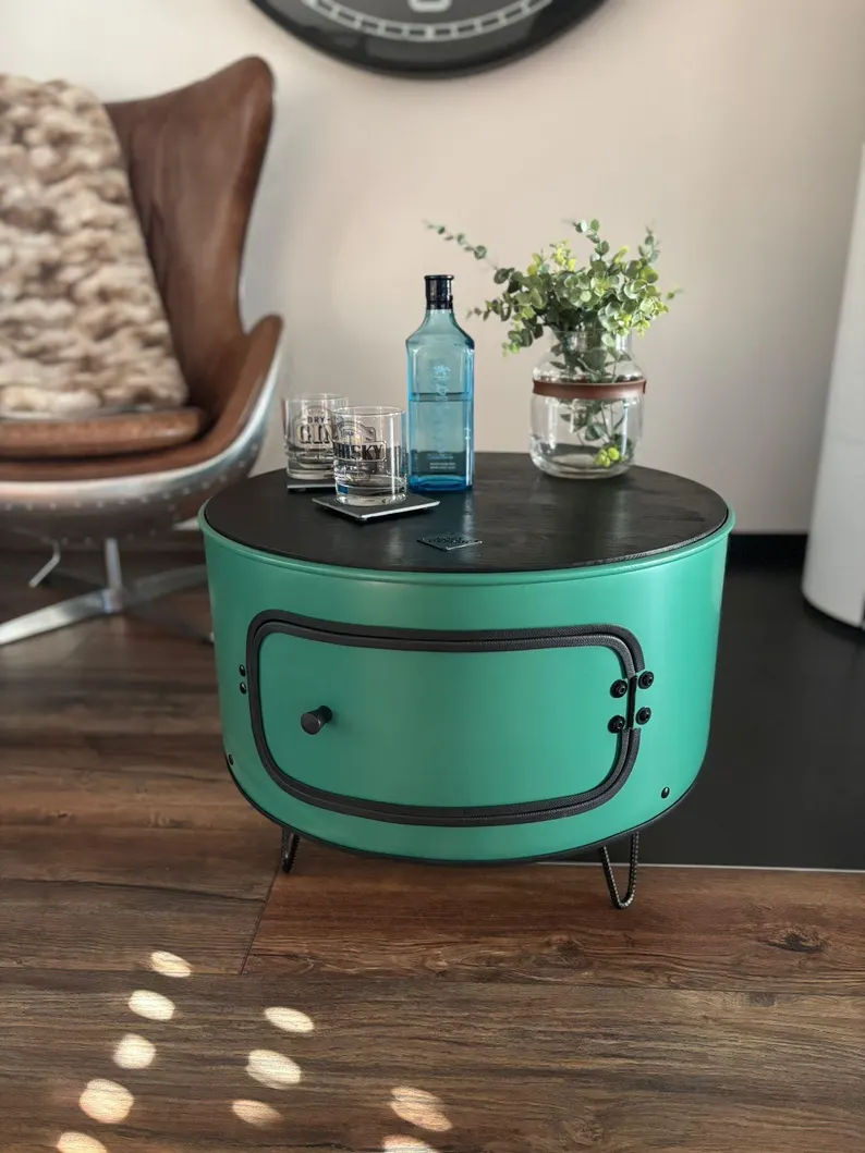 Table basse industrielle KILLEFIT en tonneau métal recyclé – 208 L – Design upcycling