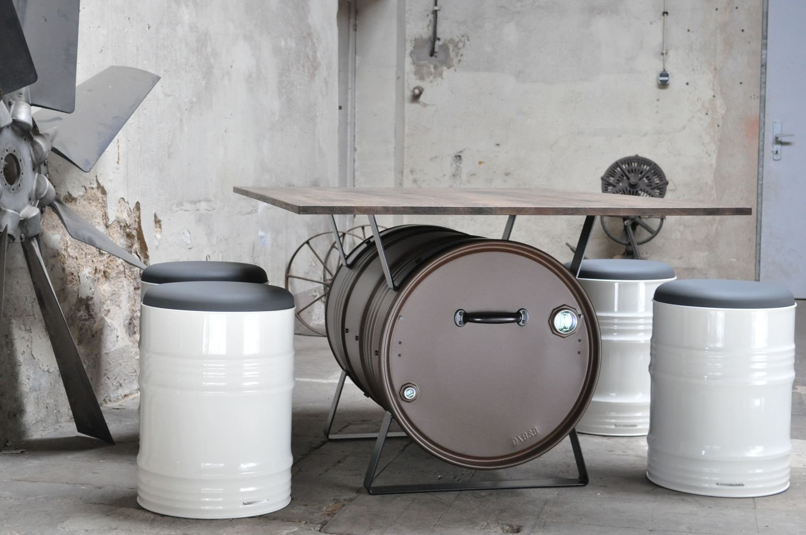 Table à manger en tonneau métal 200L avec plateau en chêne massif – Mobilier upcyclé industriel