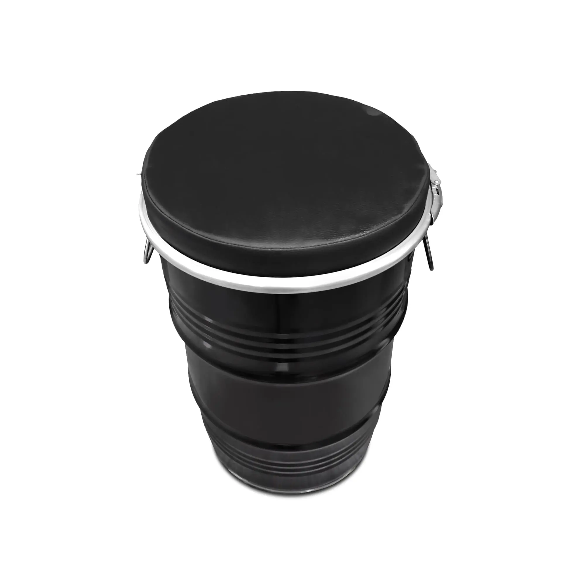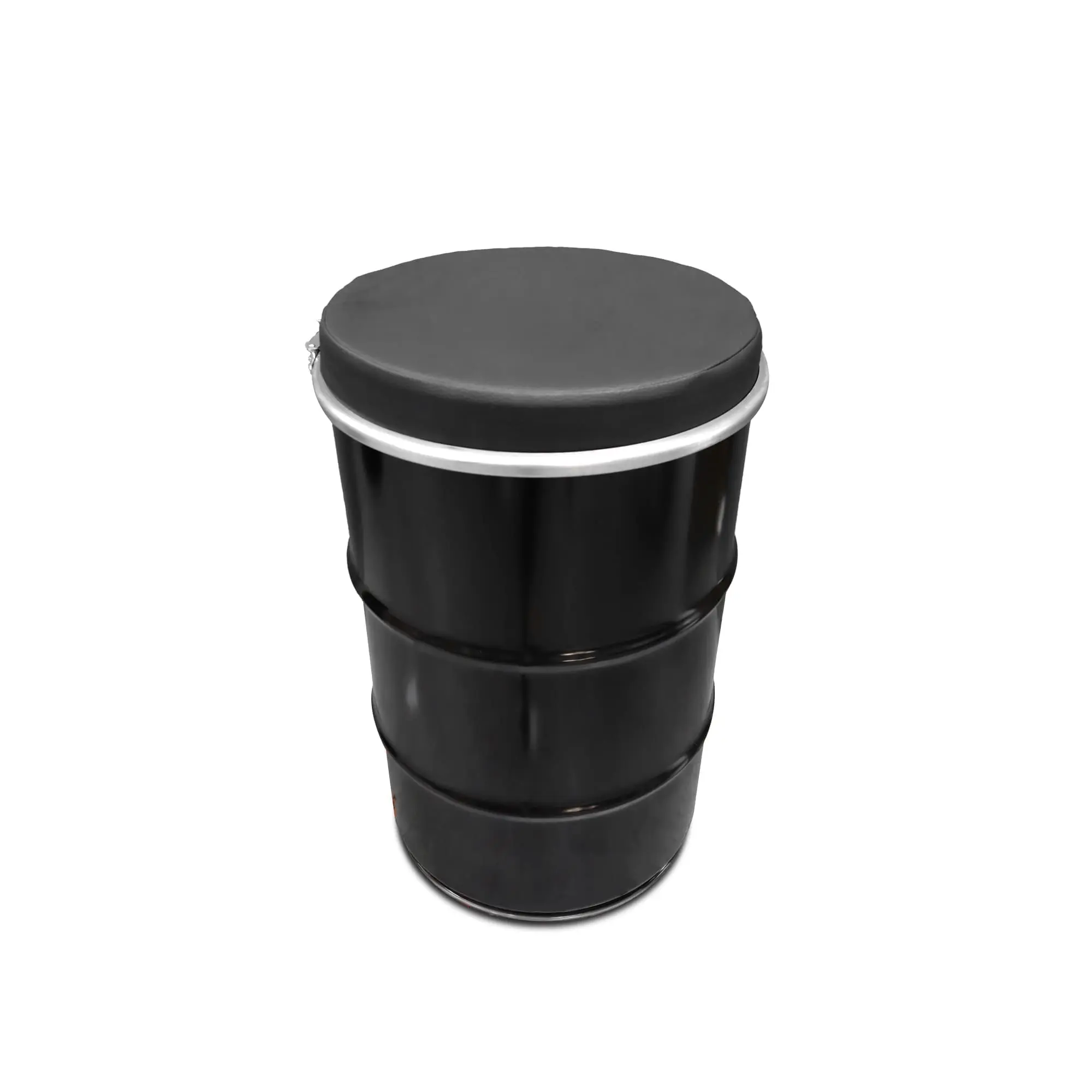 Tabouret Baril Industriel Upcyclé Noir 60L avec Coussin – Siège, Table d’Appoint & Rangement