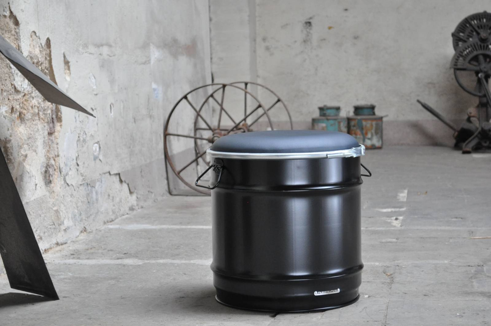 Tabouret Tonneau Métal 40L Upcyclé avec Siège Rembourré et Couvercle Amovible – Design Industriel